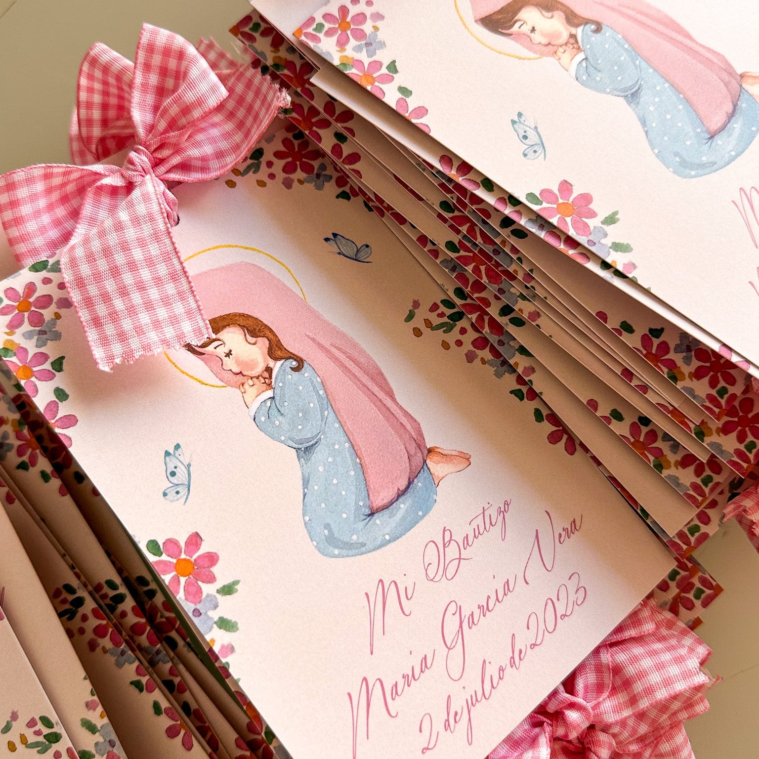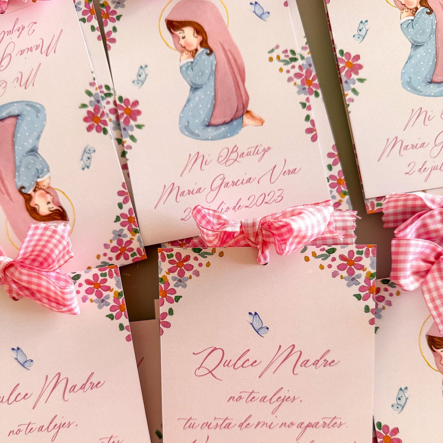 - Con diseño a dos caras. Virgencita niña a una cara con los datos de bautizo del peque y por detrás la oración.