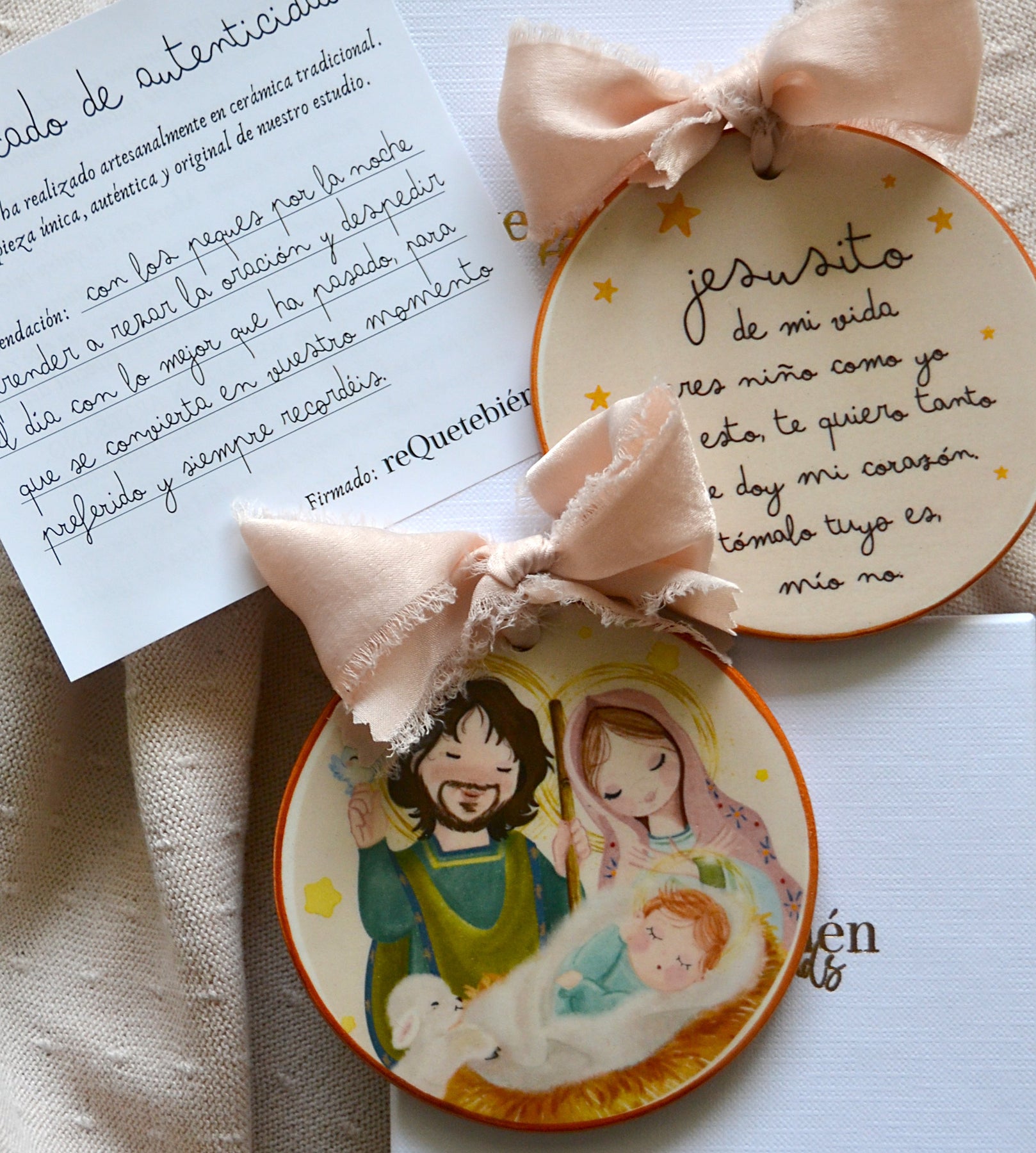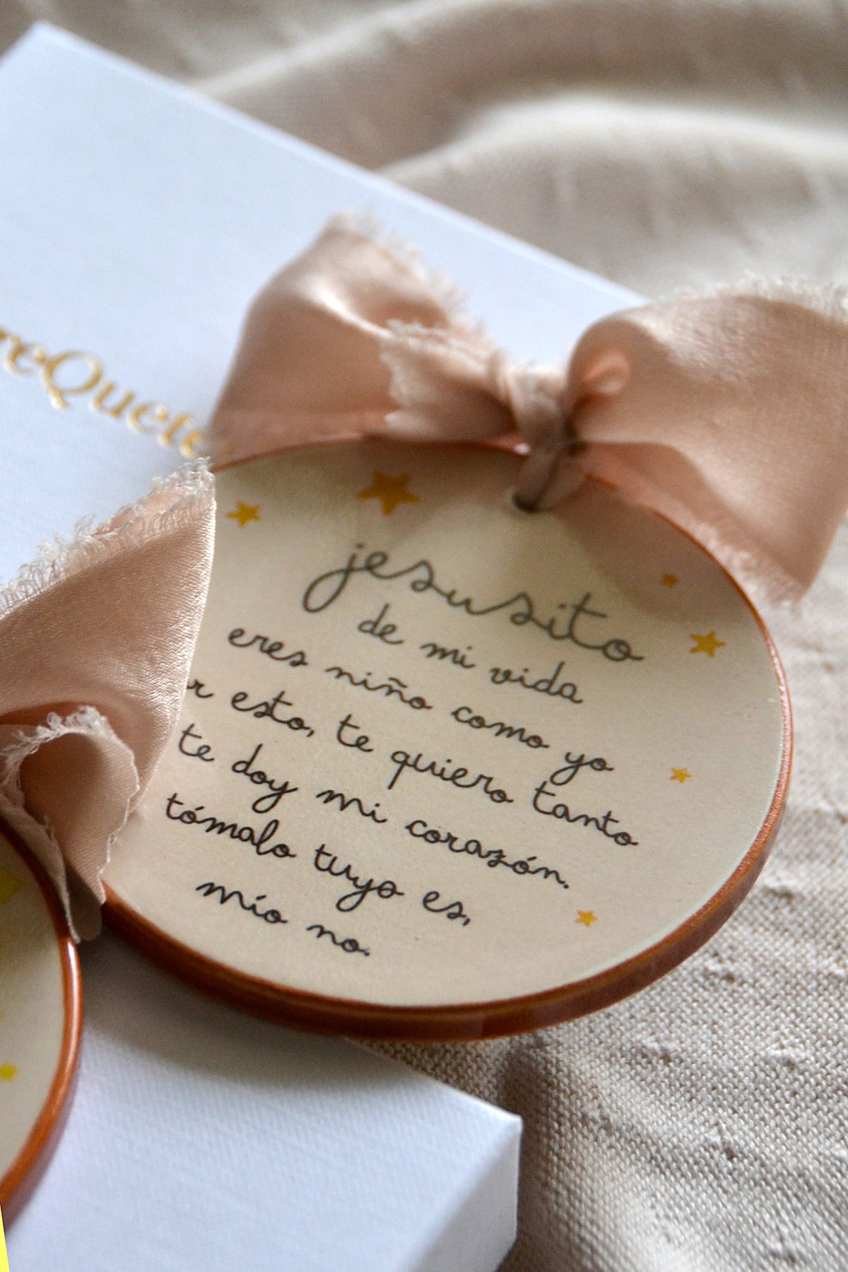 Cada pedido se prepara con su cajita forrada en tela gruesa hecha a medida y su certificado de producto artesano y una oración impresa, si la cerámica no la lleva. En el certificado os explico con más detalle como se ha preparado artesanalmente y uno a uno vuestro medallón. Así, te llegará el regalo perfecto ya listo, tanto para tus peques, como para amigos y familiares. Te vas a emocionar con él.