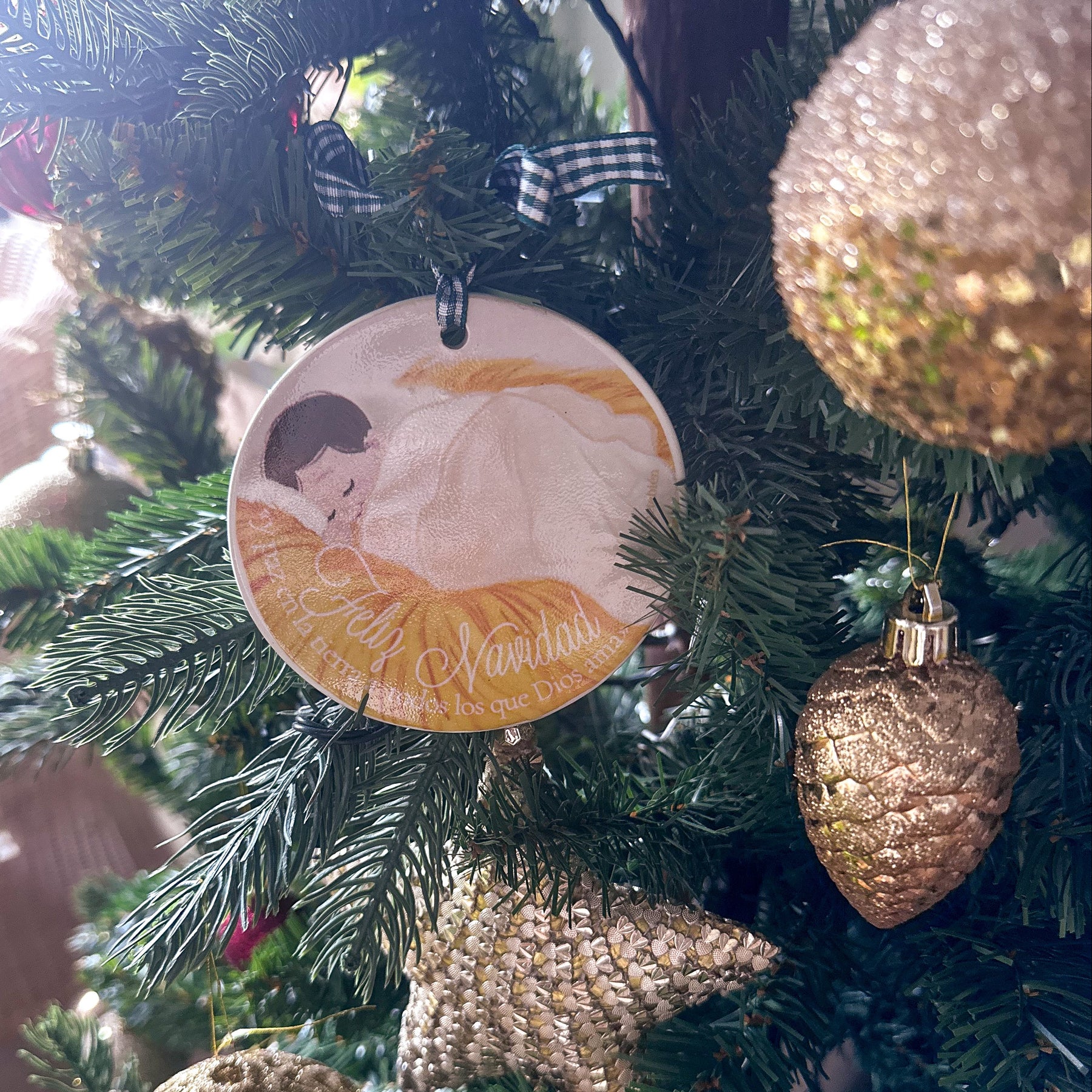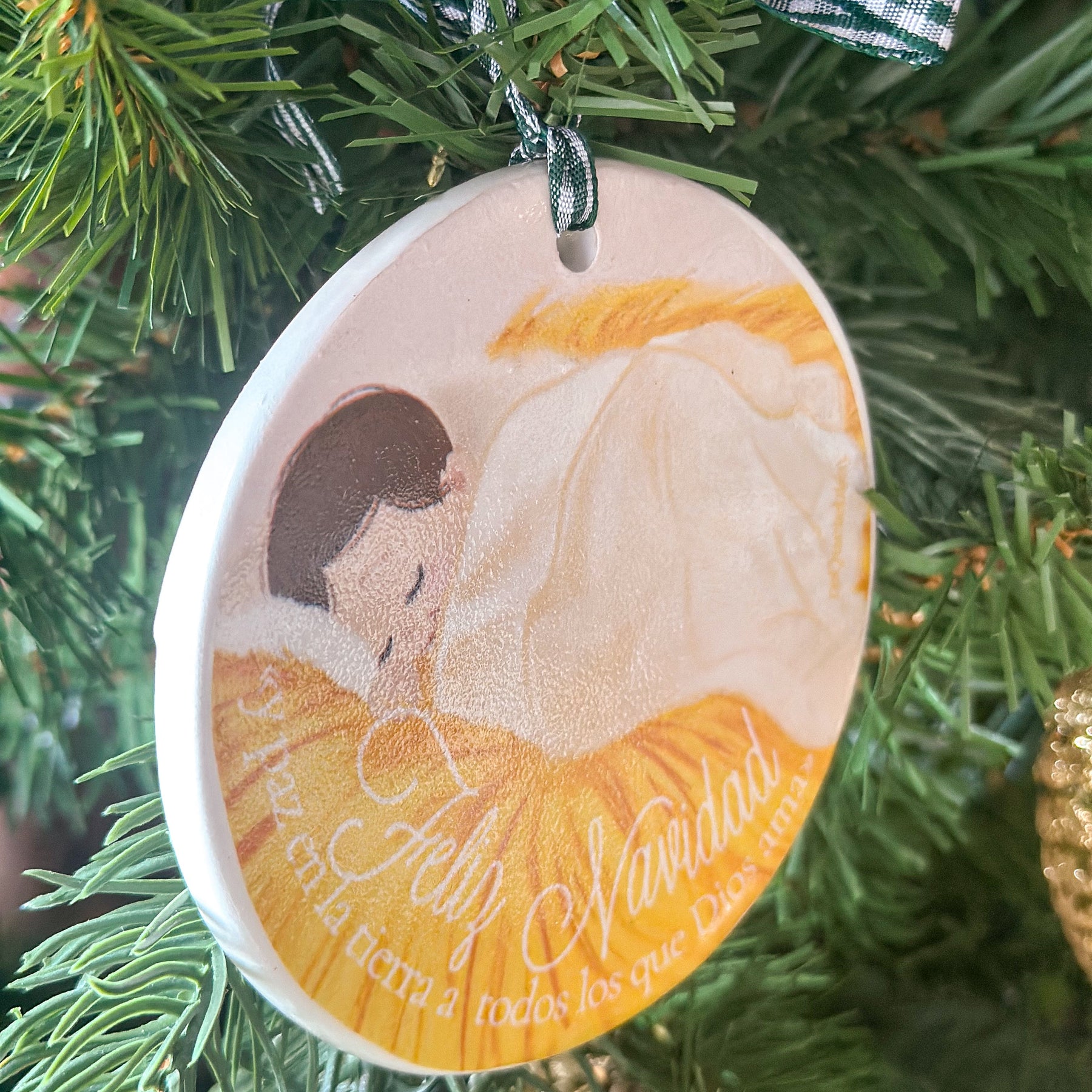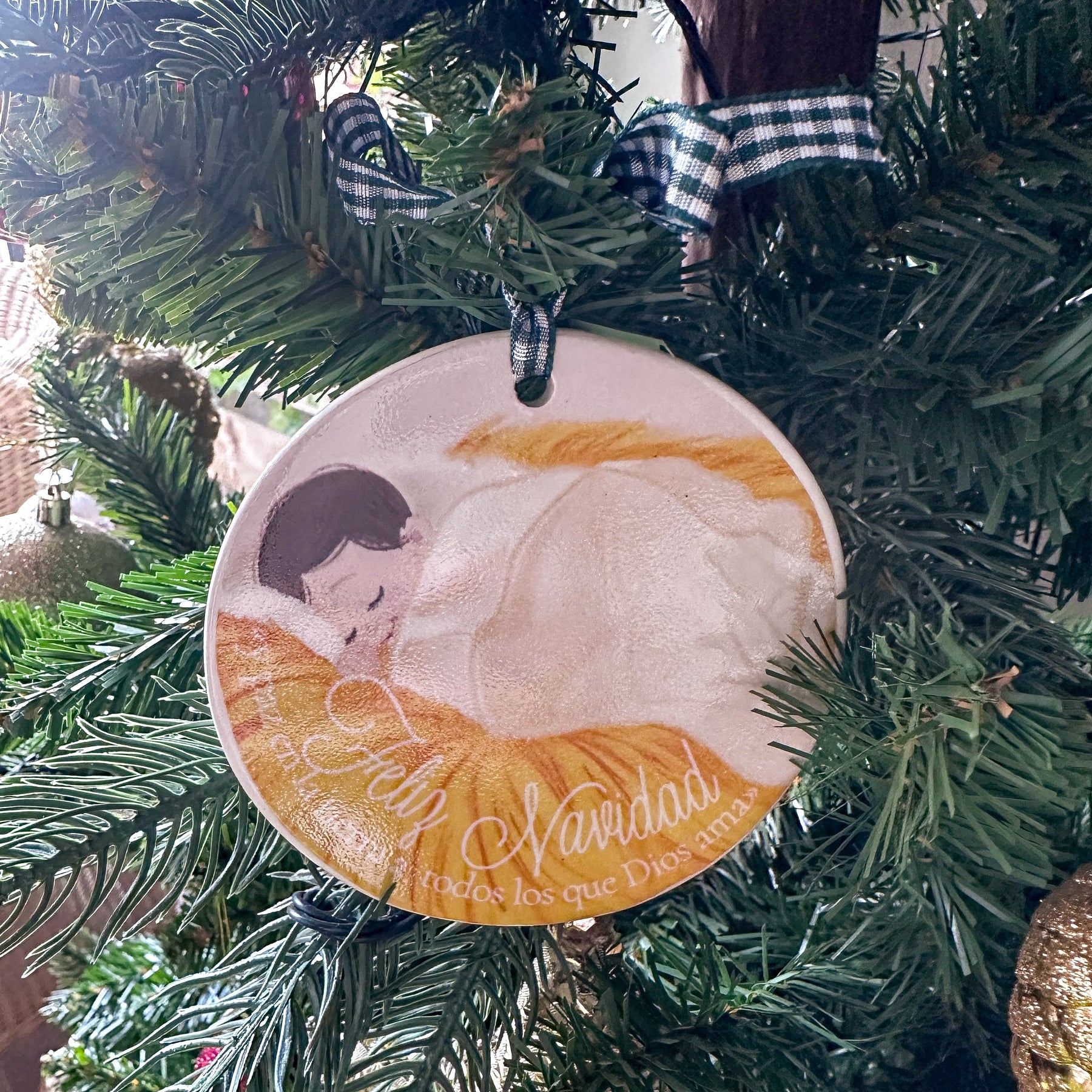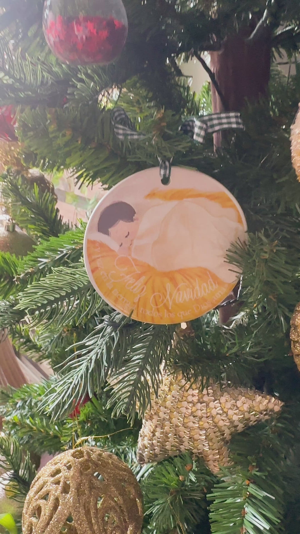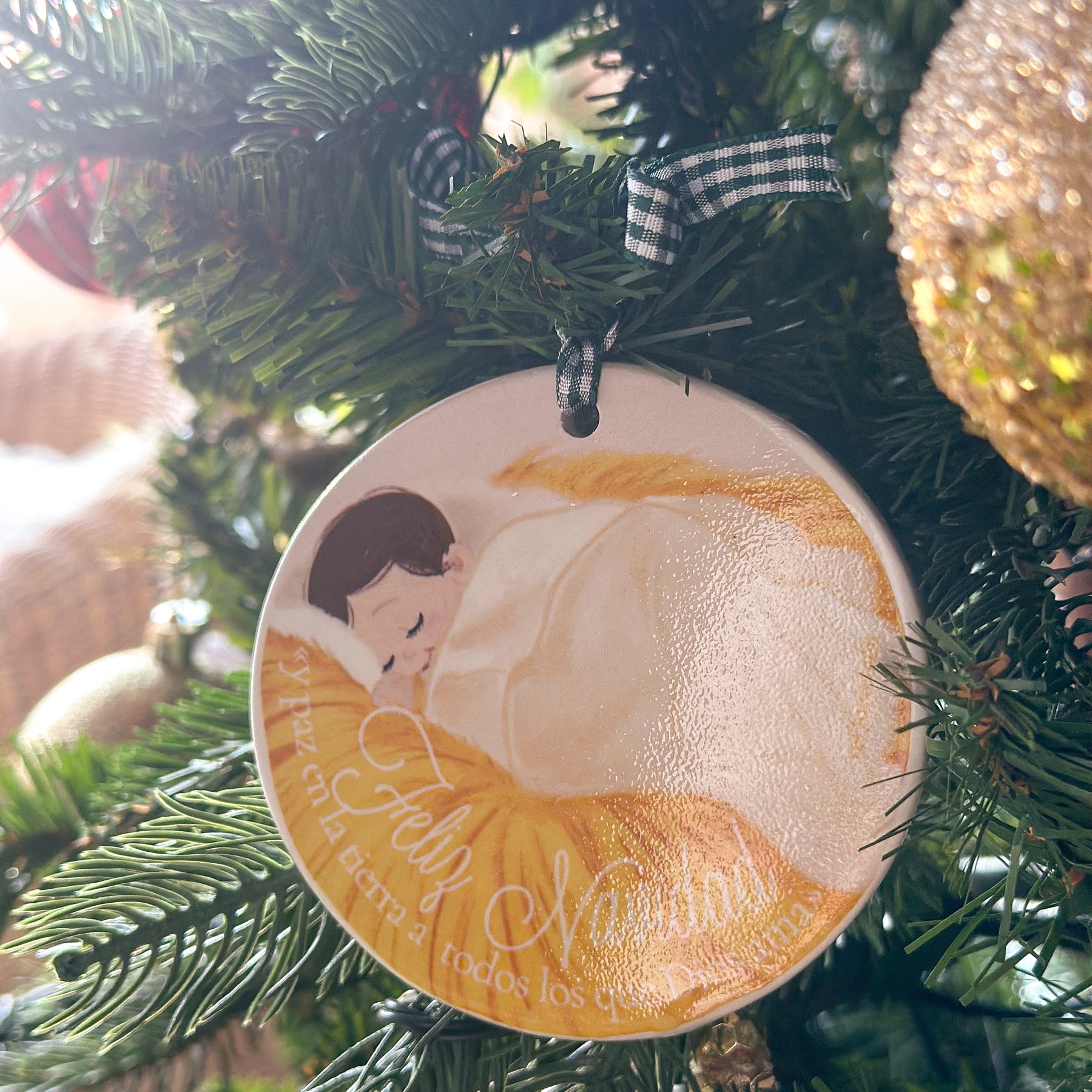 Un adorno ilustrado a mano con una escena dulce del Niño Jesús descansando para llenar de luz y amor vuestro árbol esta Navidad y más adelante vuestro hogar. Sus tonos cálidos y trazos suaves llenan cualquier rincón de paz y ternura.